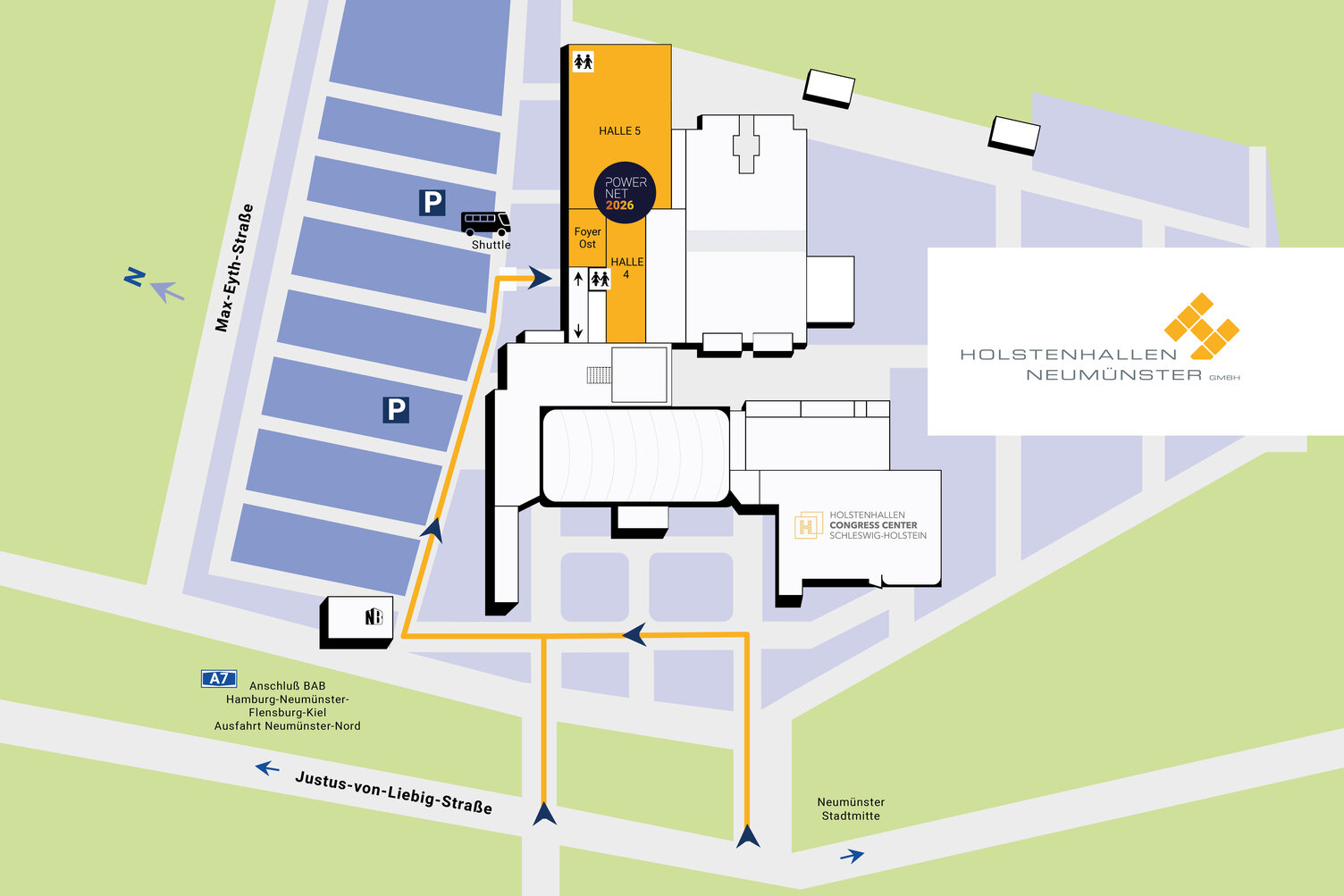 Vom Bahnhof Neumünster zur PowerNet wird ein Shuttle verkehren. Parkplätze und Ladesäulen sind ausreichend verfügbar.